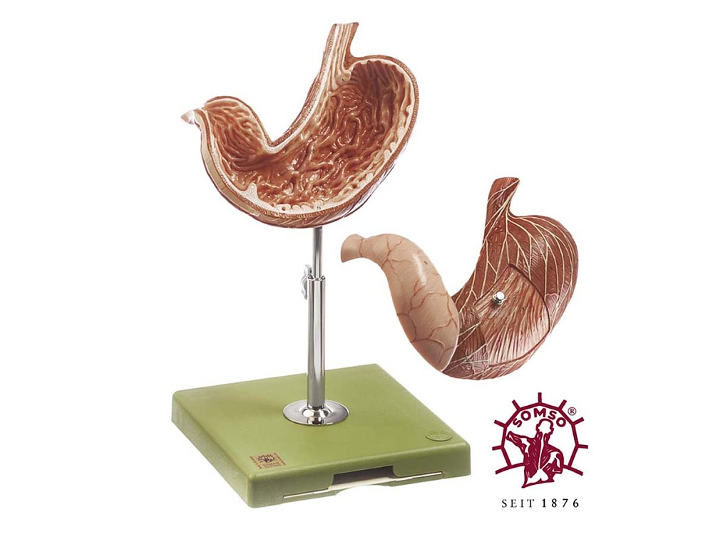 Darstellung der Längs- und Ringmuskulatur. Nach dem Öffnen sieht man Cardia und Pylorus, das Relief der Schleimhaut und die Magenstraße sowie die Magenwand im Schnitt. Arterien- und Nervenversorgung und die Ansätze des Bauchfells sind gezeigt. In 2 Teile zerlegbar, auf Stativ mit grünem Sockel. Höhe 34 cm, Breite 19 cm, Tiefe 18 cm, Gewicht 0,8 kg |