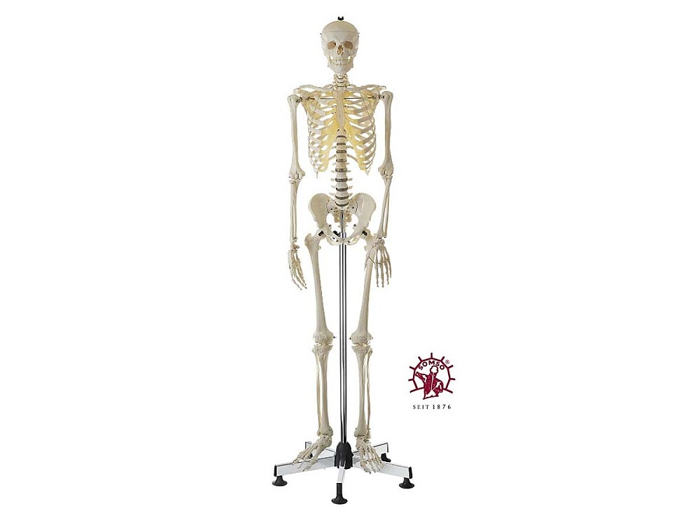Künstliches Homo-Skelettmännlich, nach der Natur modelliert, aus SOMSO-Plast®.Naturgetreue Wiedergabe der Knochenstruktur in allen anatomischen Details.Schädel mit abnehmbarem Schädeldach und Unterkiefer.Gelenke beweglich montiert, obere und untere Extremitäten abnehmbar.Der rechte und linke Fuß lassen sich vom Unterschenkel lösen.Aufrechtstehend auf Stativ montiert.Mit Staubschutzhülle. Höhe Skelett 170 cmGewicht (in kg): 10.4 kgHöhe: 179 cmBreite: 55 cmLänge: 55 cm