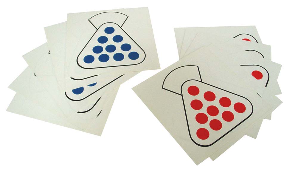 - 5 Tafeln mit blauen Punkten- 5 Tafeln mit roten Punkten, Satz Zehnersäckchen für die Hunderter-Kunststofftafel.Zur Einführung in das Dezimalsystem.Diese Plättchen dienen zur Einführung in das Dezimalsystem. Sie lassen durch Abdecken einzelner Punkte die Darstellung jeder Zahl im Zahlenraum 1-100 zu. Sie eignen sich auch zur Addition und Subtraktion im Zahlenraum 1-100.