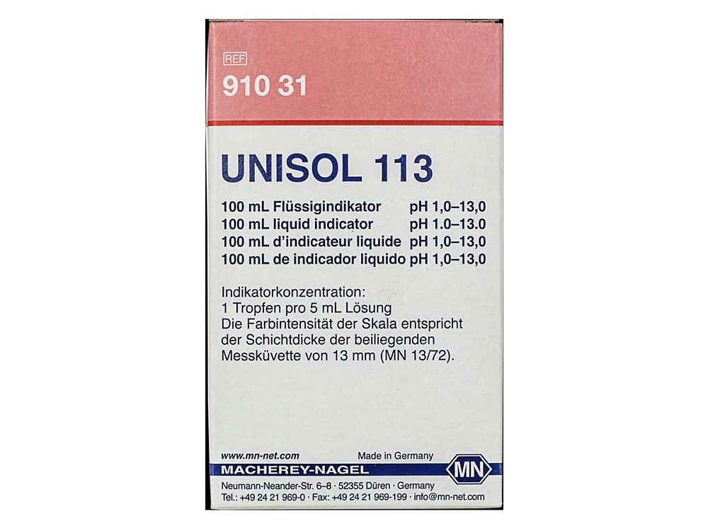 UNISOL 113 für pH 1‑13UNISOL Indikatorlösungen werden für die pH-Bestimmung in reinem Wasser, in Oberflächen-wässern und in stark verdünnten Säuren oder Laugen verwendet. Zur Probe wird eine Indikatorlösung getropft und die Reaktionsfarbe mit einer Farbskala verglichen. Damit kann auch in schwach gepufferten Lösungen der pH-Wert sicher bestimmt werden.UNISOL wird in 100 ml in Tropfflaschen, mit Farbskala und 1 Plastikküvette MN 13/72 geliefert.UNISOL 113:Abstufung: 1 · 2 · 3 · 4 · 5 · 6 · 7 · 8 · 9 · 10 · 11 · 12 · 13