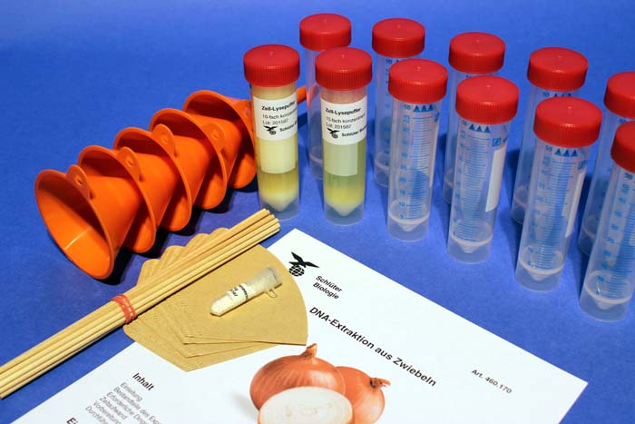 Mit diesem einfachen Versuch zum Thema Zellbiologie und Genetik können Sie ohne lange Vorbereitungszeit in einer Schulstunde chromosomale DNA aus einer Zwiebel isolieren. Nach Aufschluss der Zellen wird DNA ausgefällt und damit sichtbar. 5 Schülergruppen können parallel arbeiten, ausreichend für 15 Einzelversuche.Inhalt: 2x 40 ml Zell-Lysepuffer (10-fach konz.), 500 mg Proteasegemisch, 5 Trichter, 15 Flachbodenröhrchen, 15 Papierfilter, 15 Holzstäbchen, ausführliche Versuchsanleitung.