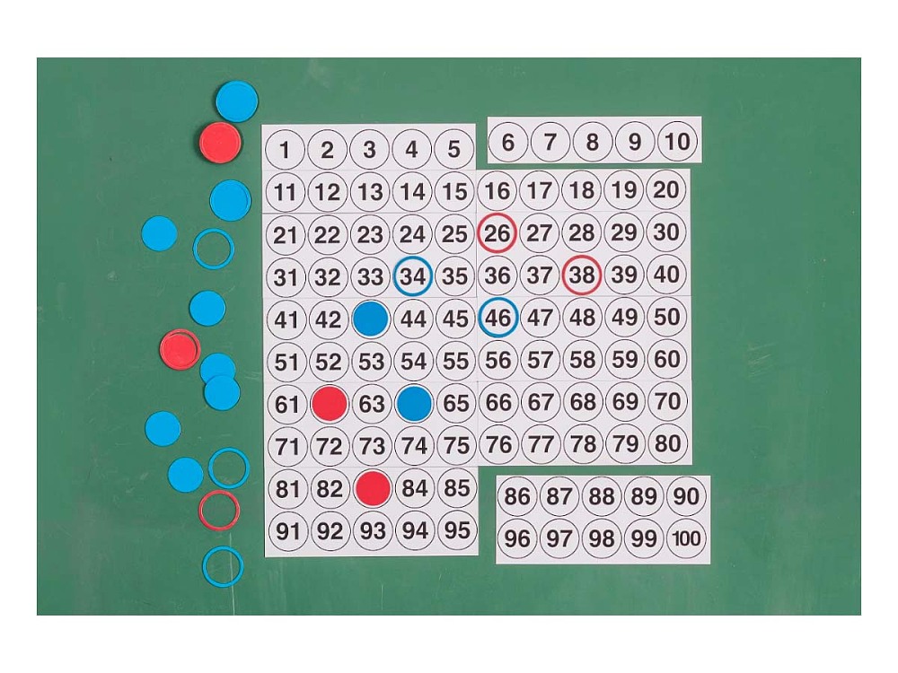 Das Hunderterfeld besteht aus 12 Magnetplatten (4x 5er und 8x 10er) mit Zahlen von 1-100 die auf eine Stahltafel aufgelegt werden können. Die Feldgröße ergibt 50 x 50 cm.