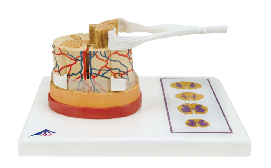 Beschreibung: Das Modell zeigt den Aufbau des Rückenmarks in ca. 5-facher Vergrößerung. Das Rückenmark setzt sich aus der den Zentralkanal umschließenden grauen Substanz und der äußerlichen weißen Substanz zusammen. Auf dem Sockel sind graphisch die bezüglich der grauen und weißen Substanz unterschiedlichen Querschnitte von Hals-, Brust-, Lenden- und Sakralmark dargestellt. Lieferung auf Sockel. Gewicht: 0,66 kg Größe: 26 x 19 x 13 cm |