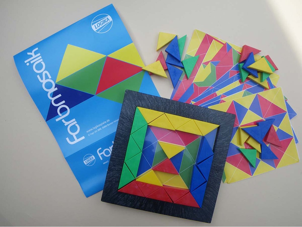 FarbmosaikBeim Farbmosaik gilt es vorgegebene Muster mit farbigen dreieckigen Mosaiksteinen nachzulegen oder Neue frei zu erfinden. Es gibt 3 Varianten und Schwierigkeitsgrade:1. Sehr leicht: Es wird eines der Farbmuster in die Platte und die Steine entsprechend Ihrer Farbe auf das Farbmuster gelegt.2. Etwas schwieriger: Die Vorlage wird neben und nicht in die Platte gelegt. Das Kind legt nun das Muster in der Platte nach.3. Noch etwas schwieriger: Das Kind guckt sich eines der Farbmuster intensiv an. Die Vorlage wird verdeckt und aus dem Gedächtnis versucht nun das Kind, das Muster auswendig in der Spielplatte nachzulegen.4. Freie Muster nach eigener Fantasie erfinden.Spieler: 1Alter: ab 3 JahrenDauer: ab 5 MinutenSolange Vorrat reichtnoch 2 Stück auf Lager_________________________________Hersteller:LOGIKA SpieleIngo Uhl GmbHQuickborner Str. 2725494 Borstel-Hohenradeninfo@logikaspiele.de