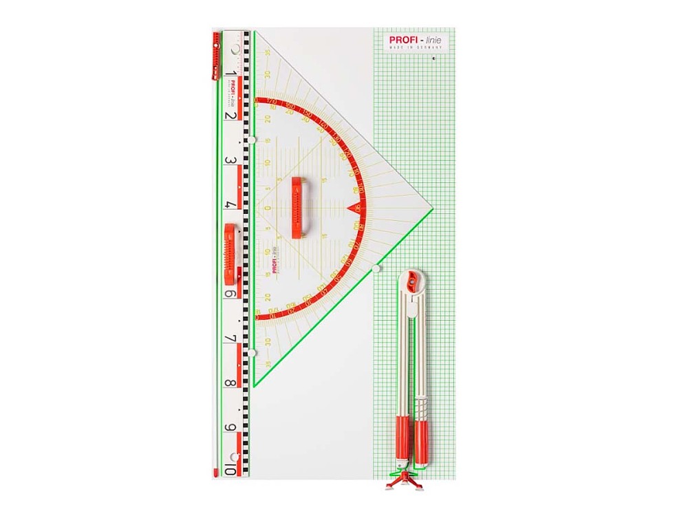 Wandtafelgerätesatz PROFI-linie II mit 80 cm GeowinkelDezimallineal 100 cmWinkelmesser 50 cmGeowinkel 45°, 80 cmZirkel mit Dreifuß und DrehgriffZeigestock 100 cm, GlasfiberRE-Plastic ist 100% post-consumer-recycelter Kunstoff, der immer wieder zu 100% recycelbar ist.Montagematerial. Im SatzkartonAlle Geräte der Tafel auch mit Magneten lieferbar = Bitte dann Magneto auswählen!Alle Geräte der Tafel auch mit Magneten lieferbar = Bitte dann Magneto auswählen!