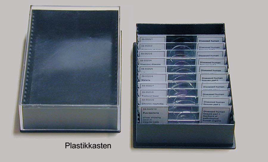 Mikroskopische Präparate können aus technischen Gründen nur in speziellen Präparatekästen versandt werden.Diese liegen in verschiedenen Ausführungen vor und müssen bei Auftragserteilung mitbestellt werden. Falls vom Besteller keine näheren Angaben gemacht werden, liefern wir zu unseren Präparateserien und zu Einzelpräparaten Aufbewahrungskästen unserer Standardausführung in passender Größe. Plastikkasten:Solide, stapelbare Ausführung, mit Zahnleisten und transparentem Deckel - für 25 PräparatePappschachtel:Einfache Transport- und Aufbewahrungsschachteln aus Pappe - für 50 PräparateStandardausführung:Stabile, mit schwarzem Lederimitationspapier überzogene Aufbewahrungskästen, innen mit numerierten Zahnleisten zum Einstecken der Präparate.für 25 Präparatefür 50 Präparate
