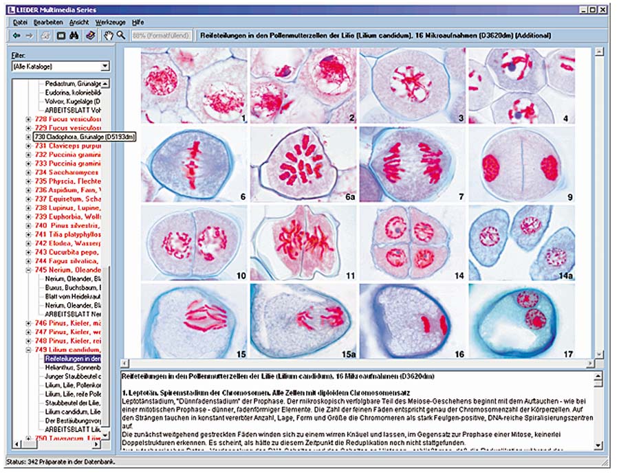 Im Rahmen unseres Multimedia-Programms “Mikroskopische Biologie” liefern wir interaktive CD, die auf unsere Schulserie D abgestimmt ist. Das Basismaterial bildet hervorragende Mikrofotos aller in der Schulserie enthaltenen Mikropräparate in mehrfachen Vergrößerungsstufen und Bildausschnitten. Darüberhinaus werden eine große Zahl zusätzliche zu den Themen passende Präparate gezeigt, die der Erweiterung der vorhandenen Präparateserie dienen. Anatomische Farbtafeln und schematische Zeichnungen sowie ausführliche Texte zu allen Einzelthemen dienen der Erläuterung der Präparate und können ausgedruckt werden.