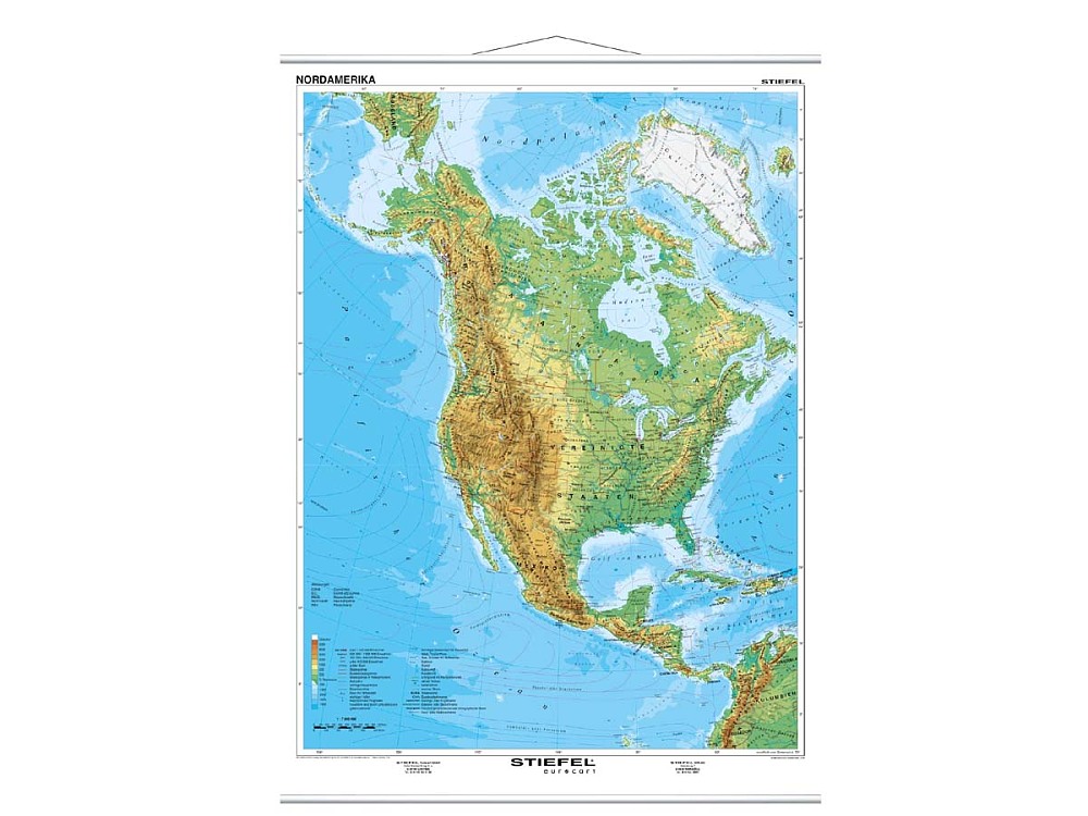 Wandkarte Nordamerika physischMaßstab: 1:600 000 - Format: 140 x 190 cm - Darstellung mit Gebirgen (Relief und Höhenschichten- Gebirgs- und Landschaftsbezeichnungen- Mit Ländergrenzen, wichtigen Städten und Fluss- und Gewässernamen- Mit Holzstäben und Aufhängeschnur- Beschreib- und abwischbar mit wasserlöslichen Folienstiften- Brandschutzmaterial B1 (B1 = schwer entflammbar, nach der in Deutschland geltenden Brandschutznorm)____________________________Hersteller:Stiefel Eurocart GmbHFelix-Wankel-Ring 13 aD-85101 Lentingeurocart@stiefel-online.de