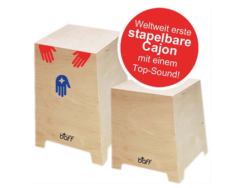 Stapelbare CajonDie neuen stapelbaren Trommelhocker sind super stabil, klingen super und sind sehr platzsparend. Ob im Kindergarten, in der Musikschule oder im Klassenzimmer, für die stapelbaren Cajons ist überall Platz, da man sie einfach aufeinanderstapeln kann.Erhältlich sind die stapelbaren Cajons in Sitzhöhe 34 cm für die Kleinen und in Sitzhöhe 45 cm für die Großen. Hergestellt werden die Kisten aus hochwertigem Birkenholz. Im Inneren befindet sich ein fest verbauter Snareteppich, der für einen ansprechenden Snaresound sorgt. Aber auch ein satter Basssound ist bei dem Hocker garantiert.Zu jedem baff STACK Cajon gibt es unsere Handaufkleber, damit man die Töne Bass und Snare markieren kann. Ebenfalls wird ein kostenloses Trommelheft mit Rhythmusübungen und Kinderlieder zum Nachspielen mitgeliefert.Cajon Sitzhöhe 34 cm:Maße: 34 x 31 x 31 cm (HxBxT)Gweicht: 1,9 kggeeignet ab 4 Jahren inkl. Trommelheft und HandaufkleberCajon Sitzhöhe 45 cm:Maße: 45 x 32 x 32 cm (HxBxT)Gweicht: 2,4 kggeeignet ab 10 Jahren inkl. Trommelheft und Handaufkleber____________________________Hersteller:Baff GmbHAn der Fohlenweide 2267112 Mutterstadtinfo@baff.eu_____________________________
