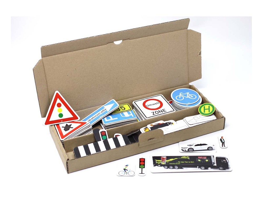 Erweiterter Verkehrszeichensatz, 124 magnethaftende Teile aus MAG-Pap°Im Karton mit Anleitung.Inhalt:64 verschiedene Verkehrszeichen,20 verschiedene PKWs und LKWs10 Ampel4 Fußgängerampeln5 Zebrastreifen8 verschiedene Richtingspfeile7 Fußgänger4 Fahrradfahrer2 MotorradfahrerDie Verkehrserziehung ist fest integrierter Teil des Sachunterrichts, meist in der 3. und 4. Klasse mit dem Ablegen der Radfahrprüfung. Hierdurch sollen die Schülerinnen und Schüler befähigt werden, sich verkehrsgerecht, sicher und verantwortungsbewusst im Straßenverkehr zu verhalten.MAG-Pap ist eine 1 mm starke mit abriebfester Farbe bedruckte Pappe verbunden mit einer 0,5 mm starken Magentfolie.Die Pappe wird durch eine durchsichtige Kunststofffolie vor Schmutz geschützt. Für alle gängigen Schultafeln geeignet. Alter: ab 6 Jahre