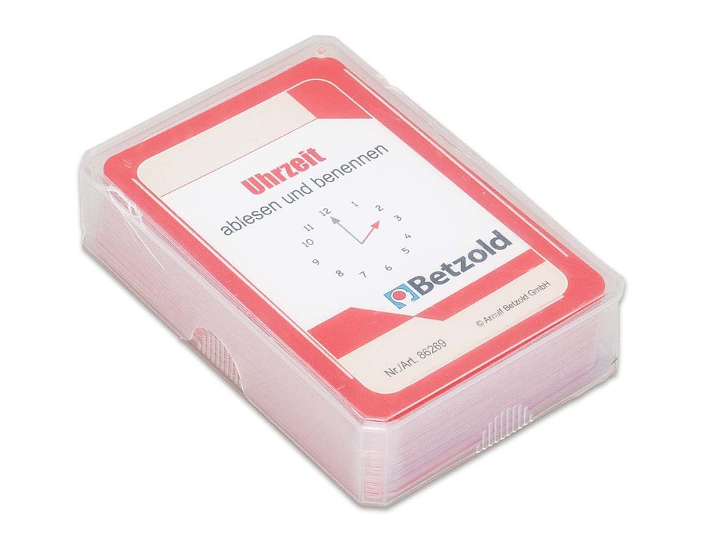Uhrzeit - Kartenset zum Magischen Zylinder- 48 Karten- mit Selbstkontrolle- im KunststoffetuiHier macht das Üben auch noch SpaßMithilfe des Kartensatz lernen Ihre Kinder spielerisch die Uhrzeit abzulesen und zu benennen. Egal ob zum gemeinsamen Spaß in der Schule oder gezielt zu Hause. Die Kinder sehen auf jeder Karte eine beliebige Aufgabe und nennen das Ergebnis. Im Anschluss werfen Sie die Karte in den Zylinder. Wie magisch wird die Karten im Zylinder gedreht. Schon erscheint die Karte mit der Lösung nach oben gedreht wieder. So zeigt der schlaue Zylinder schnell und zuverlässig das richtige Ergebnis. Das begeistert kleine Rechenkünstler und spornt zum Weitermachen an. Haben Sie die Aufgabe richtig gelöst?Bitte beachten SieIm Lieferumfang ist der Zylinder nicht enthalten._________________________Herausgeber:Arnulf Betzold GmbHFerdinand-Porsche-Str. 673479 Ellwangen (Jagst)service@betzold.de