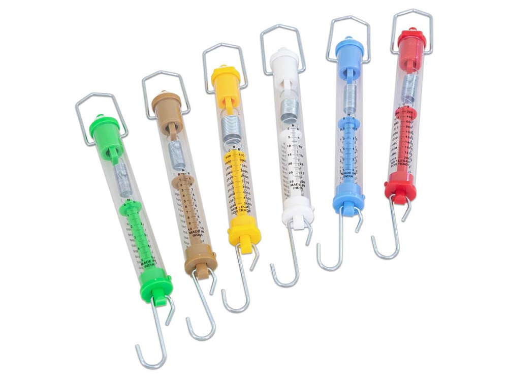 FederwaagenDie transparenten Federwaagen sind mit einer Gramm- und einer Newton-Skala beschriftet, so können sowohl Gewichte, als auch Kräfte abgelesen werden.Größe: 17 cm lang, ca. 2,8 cm ø6 Stück, von 250 g - 5000 g_____________________________Herausgeber:Arnulf Betzold GmbHFerdinand-Porsche-Str. 673479 Ellwangen (Jagst)service@betzold.de