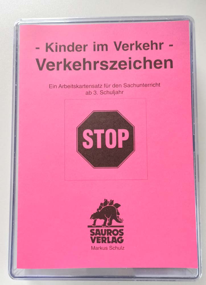 - 36 Hintergrund-Textkarten mit Feldern (15 x 8) - 2 Blanko-Karten (15 x 8) - 29 Bildkarten Verkehrszeichen (6,5 x 6,5), vierfarbig, mit Kontrollzahl - 6 Bildkarten Ampel (6,5 x 6,5), vierfarbig, mit Kontrollzahl - 1 Blanko-Karte (6,5 x 6,5) - 34 Textkarten (3 x 6,5), mit Kontrollzahl - 1 Blanko-Karte (3 x 6,5) - 1 Kopiervorlage (2-seitig) für 2 Arbeitsblätter - Lehrerhandreichung - In Kunststoffbox