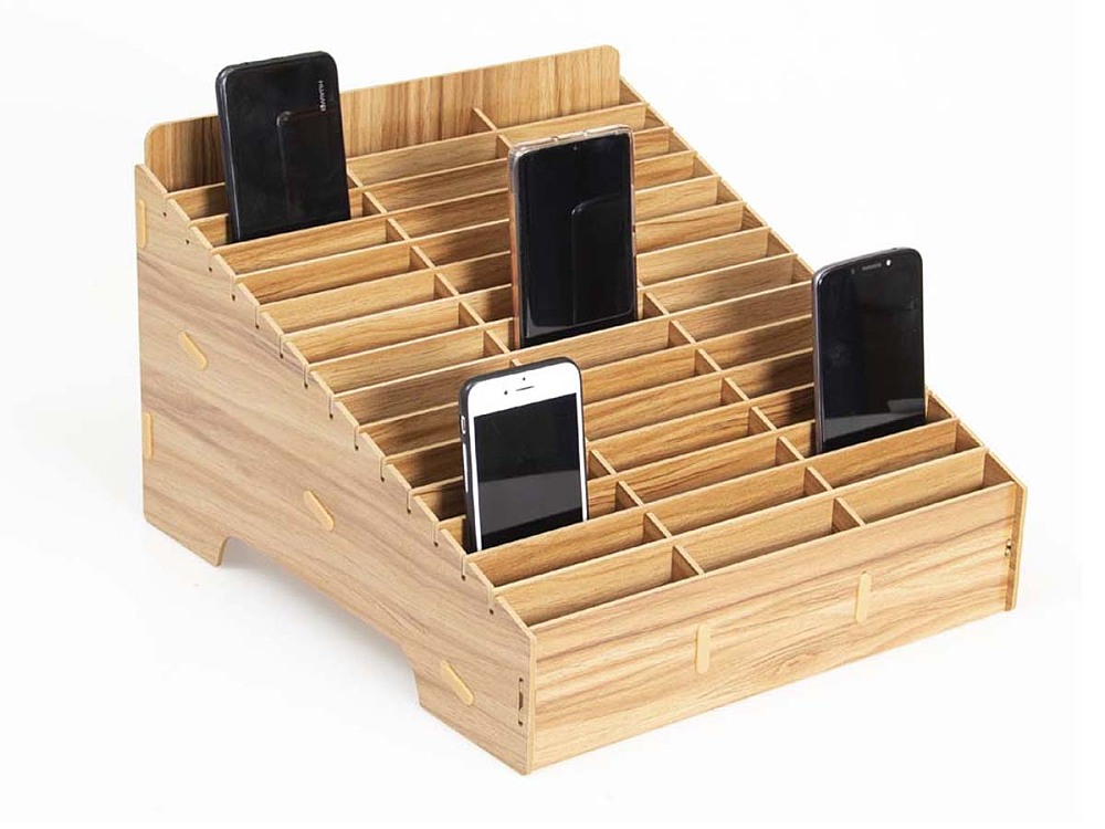 Beschreibung: Handyparkplatz für 45 Mobiltelefone, aus MDF
